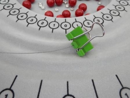 Temporarily close off one end of your beading wire using a clamp of your choice. This needs to be secure enough so that beads will not fall off the stringing wire as the project is moved about.