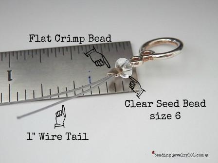 Run the wire back through the seed bead and then the crimp bead. This creates a loop to hold the clasp. Leave approximately a 1" tail of the beading wire.